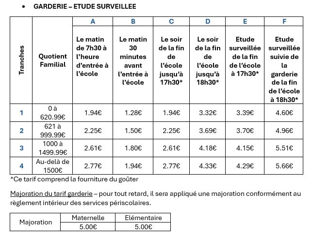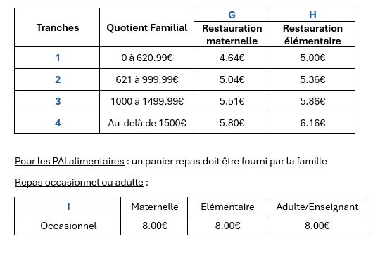TARIFS ANNEE SCOLAIRE 2025-2026 :