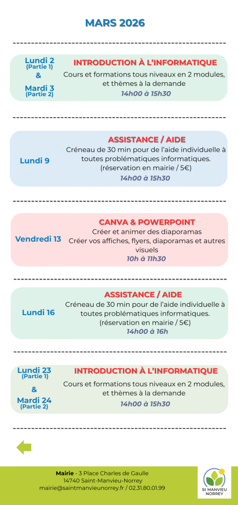 L’assistance pour le diagnostic de panne et pour l’aide à l’utilisation d’outils numérique sera dispensé le mardi et le vendredi pendant les horaires d’ouvertures.